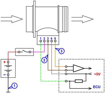 Схема подключения к датчику массового расхода воздуха BOSCH HFM5. 1 – точка подключения чёрного зажима типа "крокодил" дифференциального осциллографического щупа;