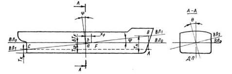 называется положение судна относительно поверхности воды. Судно может занимать различное положение. Диаметральная плоскость судна наклонена на некоторый угол q (рис. 4) по отношению к вертикальной плоскости, который называется углом крена. Плоскость мидель-шпангоута может быть наклонена к вертикальной плоскости на некоторый угол y, который называется углом дифферента.