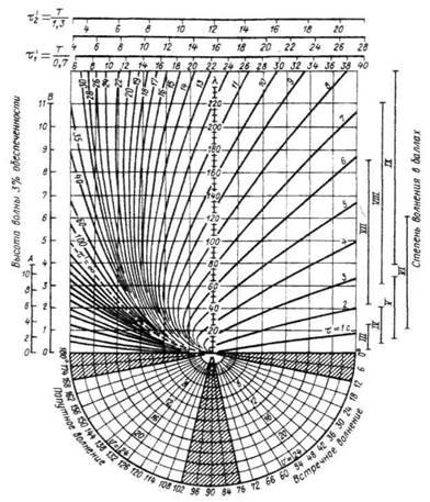 Для выбора безопасных курсов и скоростей следует пользоваться универсальной диаграммой качки. Диаграмма показывает характер изменения видимых параметров волн любой длины в зависимости от изменения курса и скорости судна. Построена она для системы волн при регулярном волнении. При волнении, которое принято считать нерегулярным, всегда возможно выделить преобладающую систему волн, измерить направление их бега и видимые периоды. Диаграмма получила название универсальной, так как позволяет решать многие задачи судовождения.