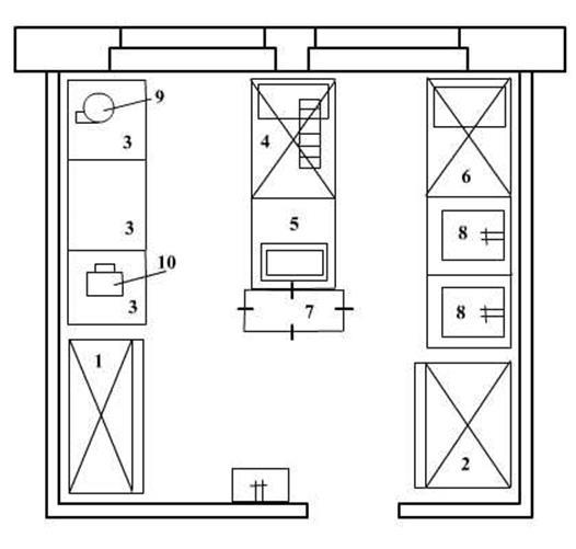 1- холодный шкаф ШХ-0.8; 2- холодный шкаф ШХ –0.6 3- стол производственный. 4- секция-стол с охлаждаемым шкафом и горкой СОЭСМ-3 5- низкотемпературный прилавок СН-0,15. 6- секция-стол с охлаждаемым шкафом СОЭСМ-2; 7- передвижной стеллаж. 8- моечная ванна ВМ-2СМ 9- машина для нарезки вареных овощей 10 – маслоделитель ручной