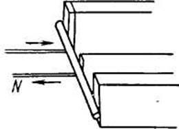 Фарадей придумал следующий эксперимент. Он пропустил пучок света, поляризованный в результате прохождения через призму Николя, между полюсами своего самого большого электромагнита и проверил, воспользовавшись другой призмой Николя в качестве анализатора, не влияет ли как-нибудь включение тока на степень поляризации света. Никакого эффекта не наблюдалось. Тогда Фарадей попробовал ввести между полюсами магнита кусок свинцового стекла и опять не обнаружил никакого эффекта. Но правильно ли было приложено поле? Может быть, оно должно совпадать с направлением распространения света? Очевидно, с одним электромагнитом опыт поставить нельзя, ибо полюсы оказались бы на пути света, поэтому Фарадей использовал два электромагнита рис. 5. На этот раз эффект был обнаружен. Степень поляризации света как будто уменьшилась.