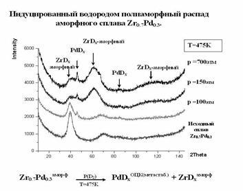 Изучена температурно-структурная эволюция аморфных сплавов при высоких давлениях (до 700 атм) и различных температурах в области стабильности аморфной фазы и обнаружено явление индуцированного водородом полиаморфного распада на гидриды компонентов с образованием метастабильного гидрида палладия с ОЦК структурой и аморфной фазы гидрида циркония (рис.2).