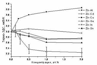в сплавах системы Zn-Cu, не изменяет его значения при легировании цинка кадмием, и вызывает уменьшение термо-ЭДС в сплавах систем Zn-Al, Zn-In, Zn-Sn и Zn-Ge.