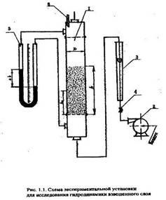 Установка (рис 1.1) состоит из стеклянной колонки 1 с внутренним диаметром D=0,055 м, воздуходувки 2 для подачи воздуха в колонку, ротаметра 3 для измерения расхода воздуха, регулировочного вентиля 4 и дифферинциального U-образного манометра 5 для гидравлического сопротивления слоя. На газопроницаемую поддерживающую решетку в нижней части колонки помещено 0,23 кг твердого материала плотностью ρтв