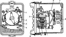 втягивается якорь .5, пускается в ход заторможенный часовой механизм б, начинают перемещаться подвижные контакты 4