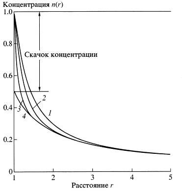Профиль концентрации вблизи поверхности частицы (см. уравнения (3.25), (3.34) и (3.47)). Концентрации нормированы на 1, расстояние измерено в длинах свободного пробега. Кривые 1-4
