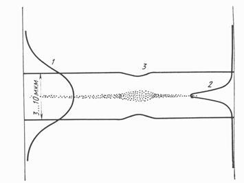 Профиль интенсивности света (1) и плотности плазмы (2) в световой нити (3-виртуальное изменение диаметра). Плотность электронов в плазме очень резко зависит от радиуса нити.