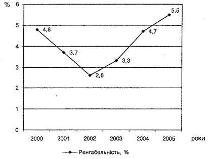 Рис. І. Рентабельність операційної діяльності промислових підприємств у 2000-2005 роках, у%*