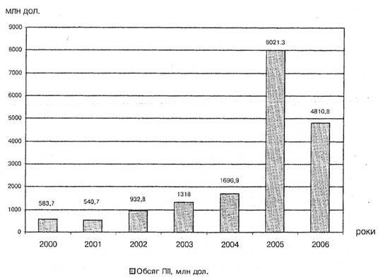 Розв'язання проблем і пожвавлення насамперед внутрішньої інвестиційної діяльності має стати сигналом для стратегічних зарубіжних інвесторів і сформувати всі необхідні передумови для активного використання ресурсів світового інвестиційного ринку. Варто відзначити позитивну динаміку зростання прямих іноземних інвестицій (ПІГ), шо спостерігається останніми роками, обсяг яких становить 16,4 млрд. дол. США на 1. 01. 2006 року і 23,1 млрд. дол. -- на 1.01. 2007 року. Прямі іноземні інвестиції на 1.01. 2005 року становили 8021,3 млн. дол. США, що в розрахунку на душу населення відповідає 176,6 дол. США проти 15 дол. США у 1995 році. Приміром, уже наприкінці 1995 року в Угорщині інвестиції становили 1000 дол. на душу населення, в Чехії — 400 дол., у Естонії — 320 дол. США. Отже, слід відзначити загалом позитивну динаміку зростання прямих іноземних інвестицій в Україну останніми роками із суттєвим пожвавленням у 2005-му та 2006 роках (рис. 3).
