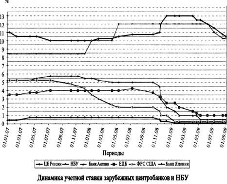 С 12 августа 2009 г. учетная ставка НБУ как ориентир цены на деньги в Украине и как наименьшая ставка рефинансирования установлена на уровне 10,25%. В кризисных условиях, когда центробанки группы стран мира для стимулирования кредитных соглашений постоянно снижали свои учетные ставки и затем удерживали их низкими (по состоянию на 1 августа 2009 г., базовая учетная ставка ФРС США составляла 0,25%, центробанков Японии — 0,1% и Англии - 0,5%, ЕЦБ - 1%,), в Украине и России соответствующие показатели были на этом фоне рекордными - 10,25% и 10,75%, что графически показано в динамике в течение 2007 г. — августа 2009 г. на рисунке.