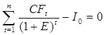 где Е – желаемая норма прибыльности (ставка дисконтирования); I0 – первоначальное вложение средств (инвестиционные затраты), CFt – чистый денежный поток в конце периода t.