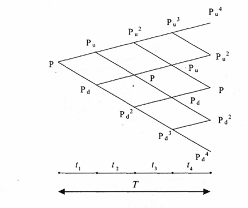 Анализируя динамику курса акций без дивидендов на каждом временном периоде, можно построить дерево распределения цены акции для всего периода действия опционного контракта (рис. 2). Если известна начальная цена акции, равная Р а, то за первый период t l ее курс может составить Р и или P d. За второй период t 2 соответственно или Р и 2 или Р d 2 и т. д.