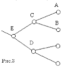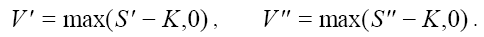 На рисунке 3 показаны узлы А и В, отвечающие моменту времени Т, и узлы С и D отвечающие моменту времени Т − ∆ t, узел Е отвечающий моменту времени Т − 2∆ t. Пусть S – цена акции для узла С, S' – цена акции для узла В, и S" – цена акции для узла А. V' – цена опциона для узла В, и V" – цена опциона для узла А. Цены опциона для всех узлов, отвечающих моменту времени Т, определяются однозначно. Например если мы рассматриваем опцион «колл», то его цена для узлов В и А определяется по следующим формулам: