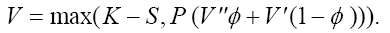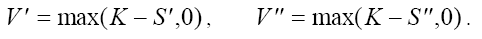 К – цена исполнения опциона, S – цена акции для узла С, V' и V" – цены опциона для узлов В и А, цена американского опциона пут, рассчитывается по формуле: