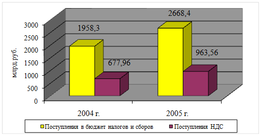 НДС является на сегодняшний день самым значимым налогом в РФ, так как его доля в налоговых сборах в федеральный бюджет является самой большей, она составила в 2005 году 36% от всех налоговых поступлений в федеральный бюджет РФ.