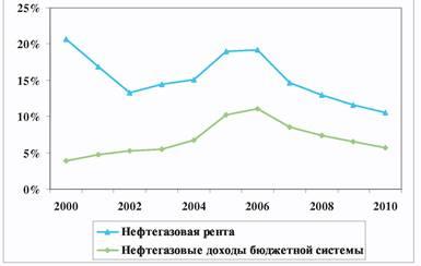 Не дивлячись на це, вибухове розширення припливу іноземного капіталу викличе подальше реальне зміцнення рубля, що скорочує питому вагу експортноорієнтованих галузей у ВВП. У результаті розміри нафтогазового комплексу, включаючи видобуток, переробку і транспортування, стабілізуються на рівні 210-220 млрд. дол., а їх доля у ВВП швидко падатиме: з 23% в 2006 р. до 13% в 2010 р. Відповідно, розрахункова величина природної ренти в нафтогазовому секторі скоротиться майже удвічі — з 19,1% ВВП в 2006 р. до 10,6% ВВП в 2010 р., як і вилучення нафтогазової ренти в бюджетну систему (див. мал. 1).