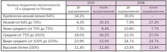 Уровень бюджетной обеспеченности в регионах России в 2006 г. до и после распределения трансфертов ФФПР (% к среднему уровню)