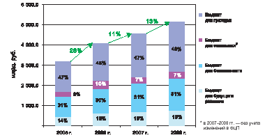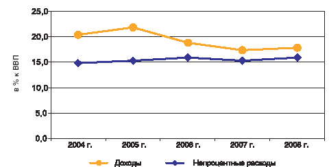 Общий объем непроцентных (не связанных с обслуживанием долга) расходов федерального бюджета в реальном выражении (с учетом инфляции) в 2006 году по сравнению с 2005 годом увеличится на 15%, а к 2008 году — на 27%.