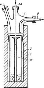 Гомогенный раствор, в состав которого входит родиевый комплекс, и высококипящие остатки от дистилляции, нагревают в реакторе, через который непрерывно проходит поток газа. На схеме применены следующие обозначения: 1 — верхняя часть стеклянного реактора; 2 —- нижняя часть стеклянного реактора; 3 — нагреватель; 4 — термопара; 5а — металлический капилляр со стеклянной входной трубкой; 56 — стеклянный капилляр; 6 — трубка для выхода продуктов. Все компоненты кубового остатка и продукты, образующиеся в результате пиролиза, выносятся из реактора током газа, а получающийся металл остается в реакционной камере.