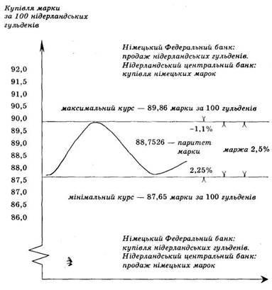 У межах ЄВС було встановлено режим вільного курсоутворення національних валют по відношенню до долара США. Для валют країн — членів ЄВС встановлено рівень максимальних відхилень курсу однієї національної валюти по відношенню до іншої в розмірі 2,25% (для Іспанії та Італії 6%), який контролювався відповідно до зміни показника "індикатора відхилень". Наприклад, якщо падіння курсу французького франка по відношенню до німецької марки перевищило певний рівень "індикатора відхилень" та було близьке до 2,25%, з метою стабілізації курсу франка Банк Франції починав продавати німецькі марки (тобто купував французькі франки, вилучаючи надлишкову їх масу із обігу), а Німецький Федеральний банк купував французькі франки, тобто купували слабкішу валюту і продавали сильнішу. З серпня 1993 р. в результаті загострення валютних проблем рамки коливань було розширено до 15%.