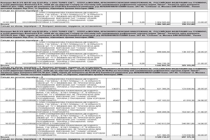 Українське підприємство з іноземними інвестиціями ЗАТ ДОЕЗ «Дніпропетровський олійноекстракційний завод» (м. Дніпропетровськ) (00374385, м.Дніпропетровськ, Україна), іменоване надалі "Продавець", яка діє на основі статуту підприємства , в особі директора Слоєва Олександра Миколайовича, з одного боку, і дочірня фірма DЕ BUNGE S.A. FRANCE (Марсель, Франція), іменоване надалі "Покупець", яка діє на основі статуту та головного сертифікату материнської фірми BUNGE S.A. (Швейцарія, route de Florissant, CP 518, 1211 Geneva 12, Switzerland), в особі директора дочірньої фірми Ніколя Саркозі та ТОВ "БУНГЕ СНГ", іменоване надалі „Комітент”, 123317,м.МОСКВА, КРАСНОПРЕСНЕНСКАЯ НАБЕРЕЖНАЯ,18, РОССИЙСКАЯ ФЕДЕРАЦИЯ іпн 7743084941, в особі директора Філатова Д.Н., який діє на підставі довіреності №4/44907 від 25.01.07р., з іншого боку, уклали даний контракт про нижченаведене:1. ПРЕДМЕТ КОНТРАКТУ, КІЛЬКІСТЬ, СТРОК І БАЗИС ПОСТАВКИПродавець продав, а Покупець купив 909 140 (дев’ятсот дев’ять тисяч сто сорок) ПЕТ – пляшок олії рафінованої, місткістю1 л, за контрактною ціною й на вибір ПокупцяТовар ОЛІЯ СОНЯШНИКОВА РАФІНОВАНА ДЕЗОДОРО ВАНА, Т.М."IDEAL", В ПЕТ ПЛЯШЦІ 1 Л , ГОТОВА ДЛЯ СПОЖИВАННЯ, насіння українського походження(Врожай2007р. Вологість7,0%. Смітна домішка3,0%. Вміст олії44,0%) на умовах DAF кордон Росії та України з поставкою протягом 1 місяця з дня підписання договору залізничними контейнерами. Опис партій товару згідно Додатку 1 до дійсного контракту.Ціль придбання товару: транзит у Францію для споживання.2. ЯКІСТЬ ТОВАРУОЛІЯ СОНЯШНИКОВА РАФІНОВАНА ДЕЗОДОРОВАНА, ЗА СТАНДАРТНИМ СЕРТИФІКАТОМ Т.М."IDEAL", В ПЕТ ПЛЯШЦІ 1 Л., ПРИЗНАЧЕНА ДЛЯ СПОЖИВАННЯ. ВИРОБНИК ЗАТ з ІІ „ДОЕЗ”, КРАЇНА ПОХОДЖЕННЯ НАСІННЯ СОНЯШНИКУ УКРАЇНАІнші якісні й всі інші показники згідно офіційним державним зерновим стандартам, що діють в Україні в момент відвантаження. Фактично вищевказані якісні показники підтверджуються офіційними державними організаціями й тільки у випадку, якщо це неможливо, видається сертифікат першокласної незалежної компетентної й визнаної контролюючої організації.Кожний якісний сертифікат повинен ясно підтверджувати всі фактичні якісні показники, передбачені за справжнім контрактом.Покупець по обопільній згоді із Продавцем має право направляти своїх фахівців і / або представників першокласної незалежної компетентної контролюючої організації в термінали навантаження для контролю за якістю й станом олії, а також для перевірки придатності вагонів (залізничних контейнерів) для перевезення олії в упаковках.Якість і стан соняшникової олії є остаточними при відвантаженні згідно сертифікату, виданому офіційною компетентною державною організацією.3. ПОСТАВКА ТОВАРУПоставка товару здійснюється залізничним транспортом до кордону Укр./Рос. ст.Зерново( умови DAF згідно Інкотермс 2000). В цей момент переходять і ризики від Продавця до Покупця, відповідно правил Інкотермс 2000.Товар вважається поставленим в момент переходу вагону з товаром з відпускного терміналу залізничного прикордонного митного пункту та митну територію Росії.Доставка товару до митного кордону виконується Продавцем.Дата залізничної накладної про передачу товару під митний контроль залізниці, вважається датою відвантаження товару. Дані, зазначені в залізничній накладній повинні підтверджуватися офіційним ваговим сертифікатом.4. ЦІНА Й РАЙОН НА