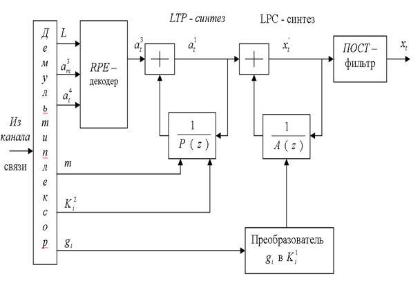 Из канала связи данные с помощью демультиплексора распределяются по различным блокам декодера. На RPE декодер поступают номер последовательности , максимальное значение импульса выборки , представляющей собой прореженный остаток предсказания.