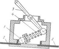 В штоковых выключателях скорость переключения контактов определяется скоростью перемещения производственного механизма. При малой скорости взаимное перемещение подвижных и неподвижных контактов происходит медленно, что приводит к длительному горению дуги, возникающей между размыкающимися контактами, и их быстрому разрушению из-за оплавления и усиленного окисления. Для нормальной работы такого выключателя скорость перемещения механизма должна быть не менее 0,5 м/мин. А для обеспечения мгновенного переключения контактов используются специальные пружинные механизмы, освобождающиеся с помощью спусковых механизмов (собачек). Пружины также используются для обеспечения необходимой силы контактного нажатия. На рис.7 показано устройство простого конечного выключателя.
