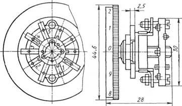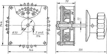В радиоэлектронной аппаратуре используются аналогичные пакетным переключатели — так называемые галетные. Они имеют от 2 до 11 положений при числе секций (галет) от 1 до 4. На рис.6 показан переключатель серии ПГС на 10 положений.