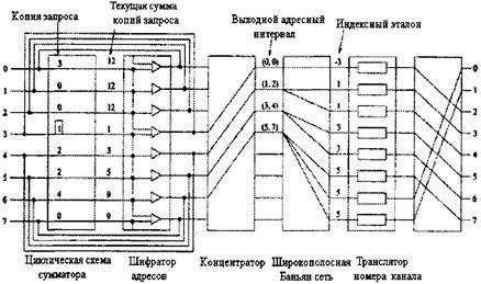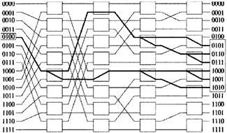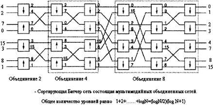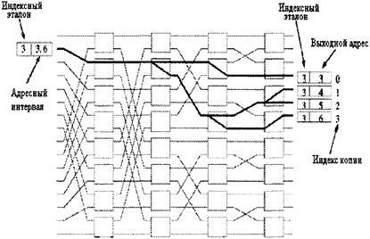 Однако в каждом временном интервале для передачи одного пакета с входа на выход требуются не все переключатели, имеющиеся в дереве. Возможно совместное использование переключателей несколькими разетвителями. Путем добавления пар входных каналов к уже имеющейся структуре можно соединить между собой N входов и N выходов, используя только (N / 2)log2 N элементарных двоичных переключателей.