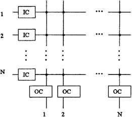 Коммутационный элемент является основной частью коммутатора [4,5,6]. На порту информация поступившей ячейки анализируется и ячейка затем направляется на определенный выход. Обычно коммутационный элемент состоит из взаимосвязной сети, выходного контроллера (1C) для каждой входящей линии и выходного контроллера (ОС) для каждой исходящей линии (рисунок 1.1). Для предупреждения чрезмерной потери ячеек в случае внутренней коллизии (противоречия) (2 или более ячейки «соревнуются» на одном и том же выходе одновременно), внутри коммутационных элементов необходимо предусматривать размещение буферов.