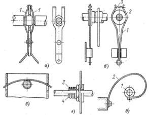 Рисунок 1.2 – Устройство токосъемов (а и б – пружинные токосъемы, в – пружинный упрощенный, г – цанговый токосъем, д – с гибким выводом).