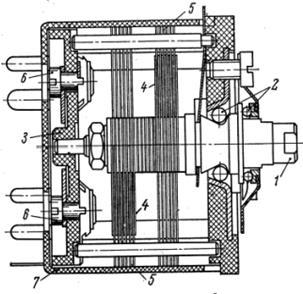 Рисунок 1.4 – Блок конденсаторов переменной емкости с твердым диэлектриком (1 – ось, 2 – передний подшипник, 3 – задний подшипник, 4 – ротор, 5 – статор, 6 – построечные конденсаторы, 7 – крышка).