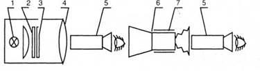 1- источник света; 2 - молочное стекло; 3 – тест-объект; 4 – объектив коллиматора; 5 – зрительная трубка; 6 – испытуемый ПНВ; 7 – держатель прибора.