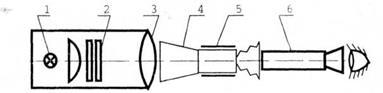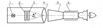 1 – источник света; 2 – молочное стекло; 3 – тест-объект в виде шкалы; 4 – объектив коллиматора; 5 – испытуемый прибор; 6 – держатель прибора.