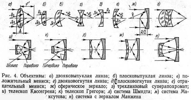 Важнейшей частью оптической системы любого оптико-электронного прибора является объектив (рис.4), который служит в первую очередь для сбора (фокусирования) энергии и образования изображения наблюдаемого объекта и всего поля излучения. Требования к качеству этого изображения определяются задачами, стоящими перед всем прибором, условиями его работы и конструктивными особенностями. При выборе конструкции объектива всегда приходится искать компромиссное решение с точки зрения улучшения пропускания, т. е. уменьшения потерь излучения, и обеспечения заданного качества изображения.