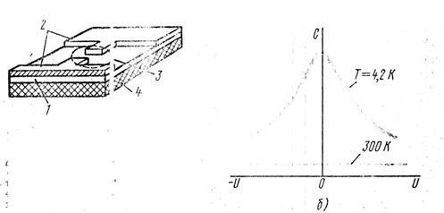 4. Принцип действия параэлектрических усилителей основан на использовании явления высокой поляризации некоторых диэлектриков (например, ) при низких температурах. Тангенс угла диэлектрических потерь таких диэлектриков (параэлектриков) при температурах ниже 80 К сильно зависит от внешнего электрического поля. Активный элемент пароэлектрического усилителя представляет собой конденсатор, заполненный параэлектриком, помещенным в электромагнитное поле (накачка). Емкость конденсатора периодически изменяется с частотой накачки, что позволяет осуществить параметрическое усиление (рис.9.30). На рис.9.30, а приведена структура активного элемента параэлектрического усилителя, а на рис.9.30,6 - зависимость его емкости от напряжения при температуре 4,2 К. Пунктиром показана эта же зависимость при нормальной температуре (300 К).