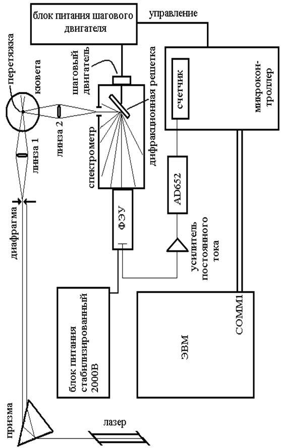 В качестве источника излучения используется импульсный лазер на парах меди, генерирующий излучение на двух длинах волн ( нм и нм). Лазер расположен на довольно большом расстоянии от спектрометра, под прямым углом к нормали падения излучения на диафрагму. Таким образом, практически исключается появление в спектре паразитных разрядных линий, которые значительно усложняют работу, а так же появляется возможность использования в качестве монохроматора лазерного излучения последовательности призмы и диафрагмы. Призма разлагает желтую и зеленую линии генерации, а также многочисленные разрядные линии в спектр, а диафрагма пропускает лишь возбуждающее излучение с длиной волны нм. Собирающая линза 1 фокусирует это излучение в кювете с исследуемой жидкостью. Линза 2 фокусирует изображение образовавшейся перетяжки на вход монохроматора МДР–23. Важно заметить, что изображение перетяжки рассматривается под прямым углом к падающему на образец излучению, поскольку в этом направлении релеевское рассеяние имеет наименьшую величину и позволяет наблюдать линии КР.