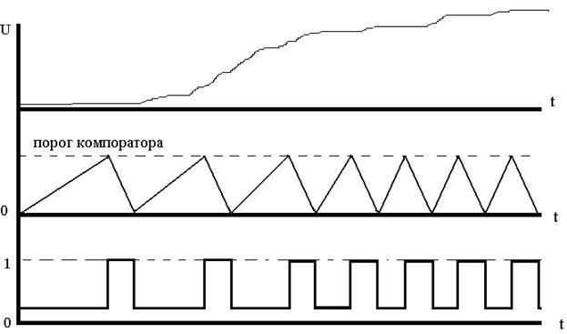 Для оцифровки полученного таким способом напряжения используется интегрирующий преобразователь напряжение – частота (ПНЧ), специализированная микросхема AD652 фирмы Analog Devices. Сочетание УПТ+ПНЧ позволяет измерять как постоянные, так и меняющиеся во времени сигналы, и даже импульсные. Полученный частотный поток поступает на счетчик микроконтроллера. Количество импульсов, накопленное за определённый фиксированный интервал времени, и образует отсчёт измеряемого сигнала, который через стандартный COM-порт передается в ЭВМ.