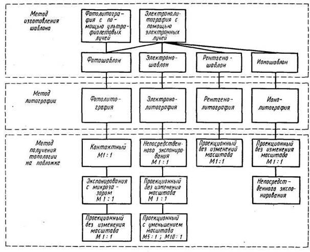В зависимости от способа переноса изображения методы литографии могут быть контактными и проекционными, а также непосредственной генерации всего изображения или мультипликации единичного изображения. В свою очередь, проекционные методы могут быть без изменения масштаба переносимого изображения (Ml : 1) и с уменьшением его масштаба (М 10 : 1;М 5 : 1).Классификация методов литографии приведена на рисунке 1.