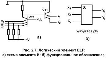 В качестве ЛЭ, дополняющих функциональные возможности типовых ECL-ИМС, применяются ИМС эмиттерной функциональной логики (EFL). Их особенностью является применение многоэмиттерных транзисторов (МЭТ), реализующих безынверсную функцию (рис. 7).