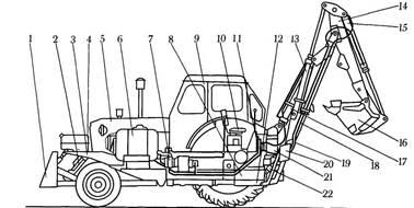 1 - відвал бульдозера; гідроциліндри: 2 - відвал бульдозера, 13 – рукояті, 15 – ковша, 17 – стріли, 22 – опор; 3, 8 - рами бульдозера і обв’язочна; 4 - паливний бак; 5 - трактор; 6 - бак гідросистеми, 7 - насосна установка, 9 - кабіна; 10 - сидіння машиніста; 11 - гідророзподільник; 12 - механізм повороту; 13 - рукоятки, 14 - рукоять; 15 – ковш; 16 - ковш; 17- стріли, 18 - стріла; 19 - з’єднувальні трубопроводи, 20 - виносна опора; 21- поворотна колона; 22 - опора;