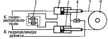 1, 4 - клапани, 2, 3- гідроциліндриповороту, 5 -ланцюг, 6 — ланцюгова зірочка
