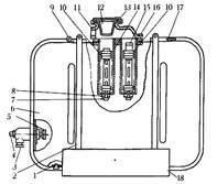 7 - трубка, 9 - масломірна лінійка, 10 - фільтруючий елемент, 11 - горловина , 12 - фільтр грубого очищення, 13 - кришка горловини, 14 - корпус (склянка) фільтра, 16 - болт, 17 - сапун, 18 – кронштейн