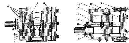 Витікання рідини по валу насоса перешкоджають манжети 9, які захищаються опорним 10 і стопорним 11 кільцями від механічних пошкоджень. Центруючавтулка 12 перешкоджає повороту шестерні 13 в зборіз обоймами і платиками під час роботи насоса. Кришку 15 до корпусу 16 насоса кріплять болтами 17. Між корпусом і кришкоюнасоса встановлено ущільнююче гумове кільце 8.