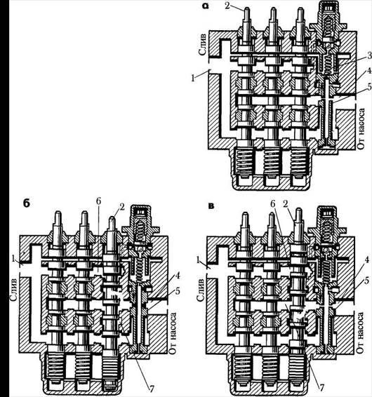 1, 4 – порожнини, 2 – золотники, 3- пружина, 5 – плунжер, 6,7 – канали
