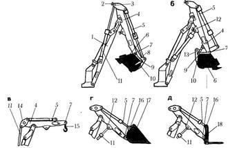Вантажний ковш 17 (Рис. 2.10, г), вили18 (Рис. 2.10, д) монтуюють на вісі 7 аналогічно прямій лопаті. Шток гідроциліндру 5 ковша кріплятьдо верхніх провушин 16 ковша (вил). Для підвищення робочих зусиль штоки гідроциліндрів 11 рукоятки приєднуютьдо нижніх кронштейнів12 рукоятки.