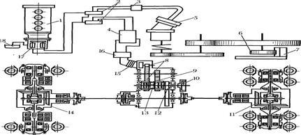 1 - дизель, 2 - блоки гідророзподільника, 3, 4 - клапанні блоки, 5, 15 - гідромотори, 6 - обігаюча шестерня, 7 - зубчатий венець, 8, 9, 12 – перша- третя передачі механізму ходу, 10 - гальмо механізму ходу, 11, 14 - передній і задній мости, 13 - зубчата муфта, 16 - центральний коллектор, 17 - подвійний насос, 18 - бак робочої рідини