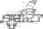 1, 3, 5 – шестерні, 2 – поворотний вал, 4, 6 – вали-шестерні, 7 – муфта, 8 – гідромотор, 9 – вал гідромотора, 10 – масломірна лінійка, 11 – корпус, 12 – маслянка, 13 – шайба