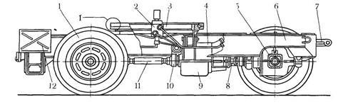 Ходовийпристрій(Рис. 3.5.) складається зізварної рами 6 нижньоговізка, спираючої на два ведучих моста 1 і 5.
