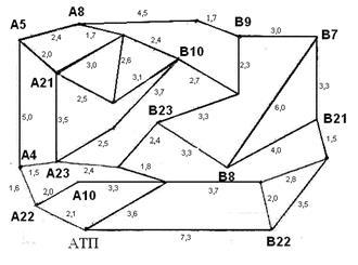 Схема территории содержит расположение автомобильного транспортного предприятия, пунктов погрузки (Ai для навалочного груза и Aij для штучных грузов) и разгрузки (Вi для навалочного груза и Вij для штучных грузов) и пути, соединяющие их.